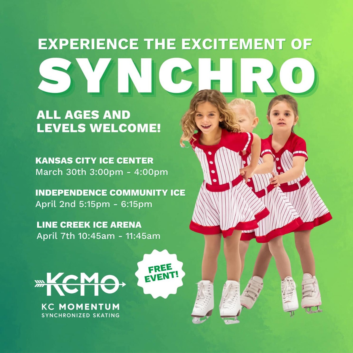 Interested in synchronized skating? Come try it for FREE! Join KC Momentum at any Kansas City rink. No experience required - open to all ages and levels, including adults!